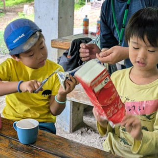 朝はカートンドック でエネルギーチャージ。牛乳パックに火をつけるだけの作業も子どもたちに